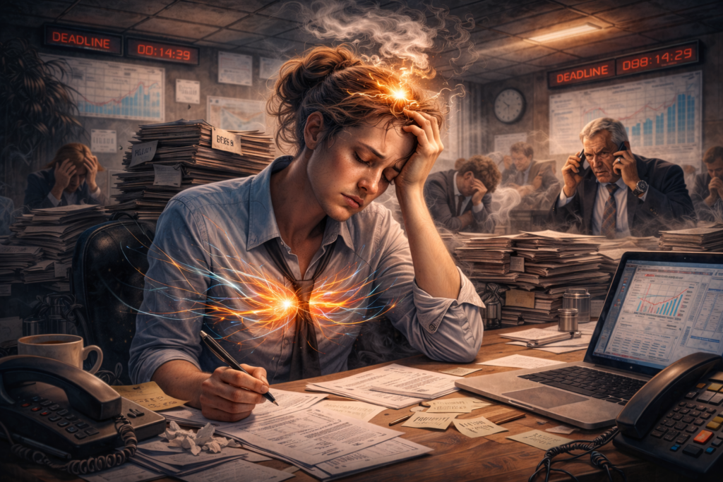 Em ambientes corporativos de alta pressão, a sensação de ameaça se mantém ativa. O profissional trabalha com a impressão de que pode falhar a qualquer momento. Avaliações constantes, metas que se renovam antes mesmo de serem alcançadas e cobranças implícitas criam um estado permanente de alerta.